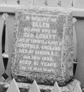 UPDATE: In 2023, I noticed that a photo in the Lovatt family fonds at the BC Archives was described as a “B&W copy print of the grave of Ellen Lovatt, in New Denver,” circa 1899, although the image was not available online.